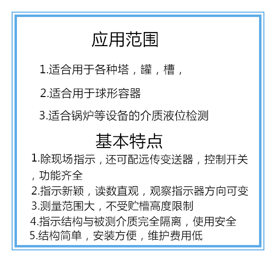 2、被測介質(zhì)與指示結構完全隔離,密封性能好,防泄露、適應高壓、 高溫、腐蝕條件下的液位測量,可靠性高。