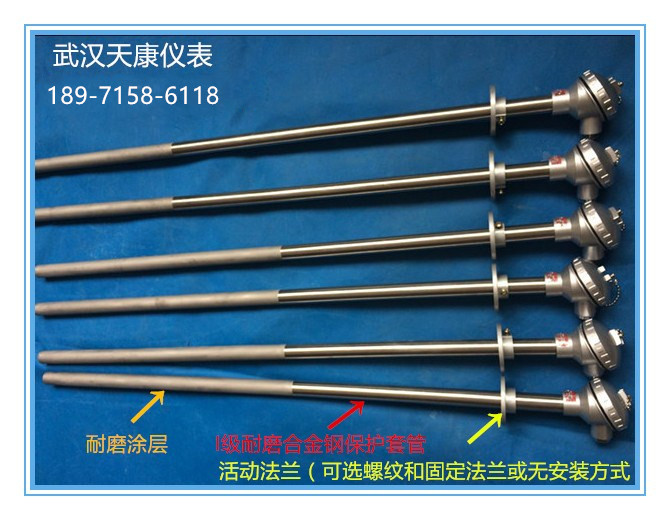 采用特種耐熱和耐磨合金材料作為測溫外保護(hù)管兼耐磨頭,內(nèi)裝鎧裝芯體,既能具有較高的對粉煤灰顆粒沖刷的耐蝕性能,又能在高溫條件下對內(nèi)芯體起到良好的保護(hù)作用。采用法蘭或螺紋的連接形式,能長期在0∽1200℃之間進(jìn)行溫度測量,是冶金行業(yè)運(yùn)用于高溫、耐磨環(huán)境中十分理想的溫度傳感器。