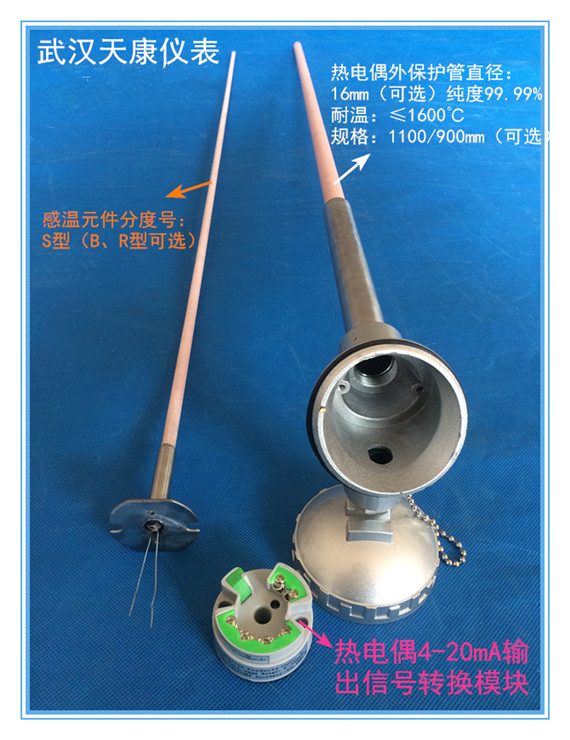 型號:WRPB-130 分度號:S 規(guī)格: L=1100/900mm (可選)量程:0-1500℃(可選)輸出信號:4-20mA(可選) 品牌:武漢天康儀表 咨詢電話:18971586118( 具體尺寸可聯(lián)系定做,定做請注明保護(hù)管直徑、長度、絲徑)
